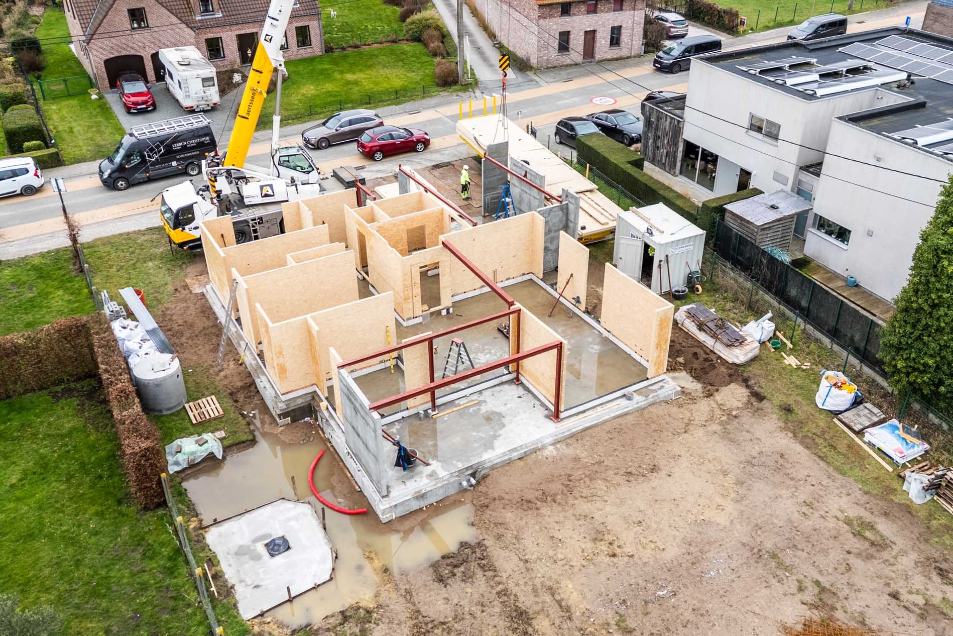 In Vurste realiseerden we een woning waarbij houtmassiefbouw centraal staat. Het beschermd volume werd volledig opgetrokken in massieve houtstructuren, waardoor de ruwbouw in zeer korte tijd uit de grond kon verrijzen.